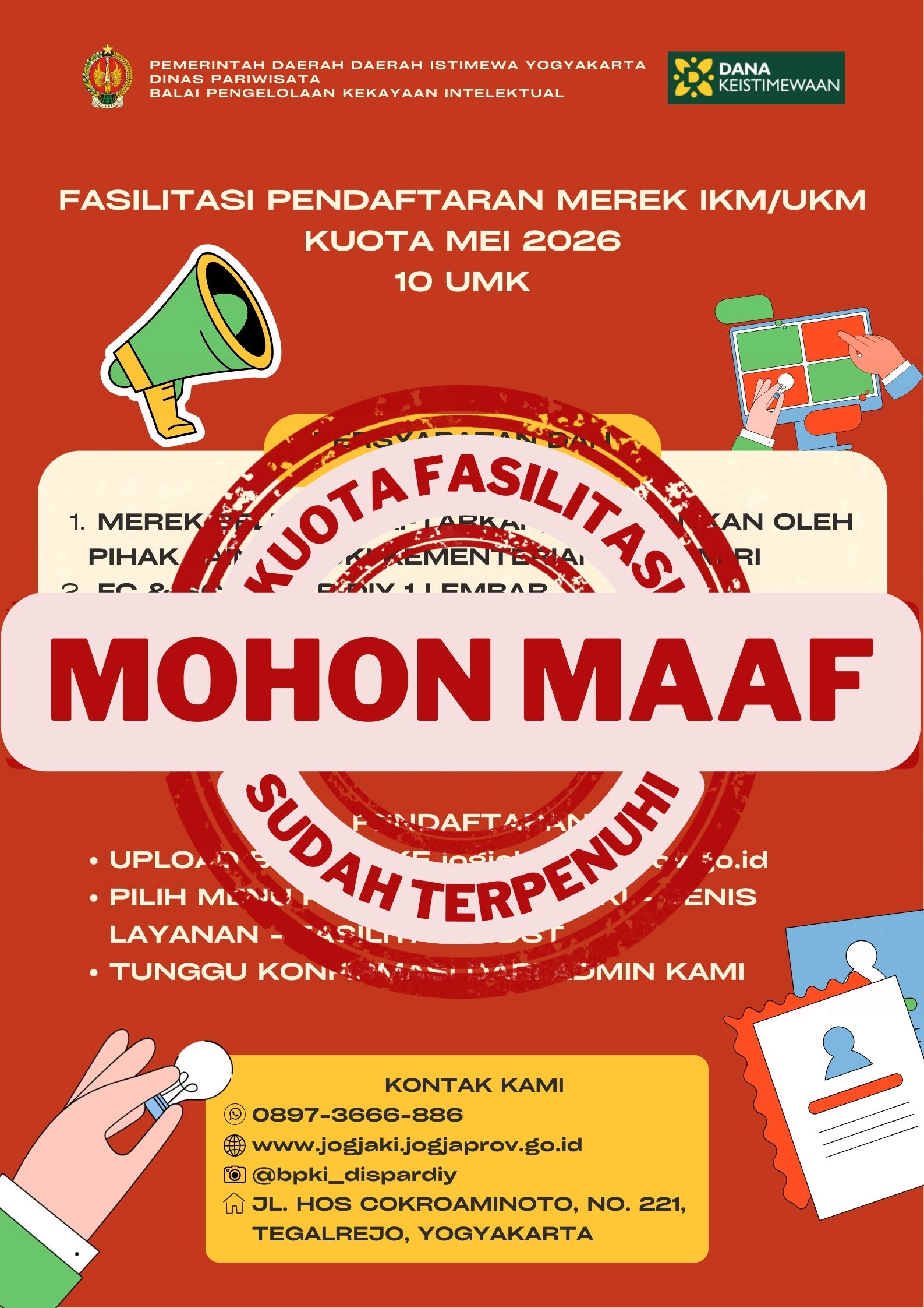 20 April 2026 MOHON MAAF UNTUK KUOTA FASILITASI PENDAFTARAN MEREK INDIVIDU KUOTA BULAN MEI 2026 TELAH TERPENUHI